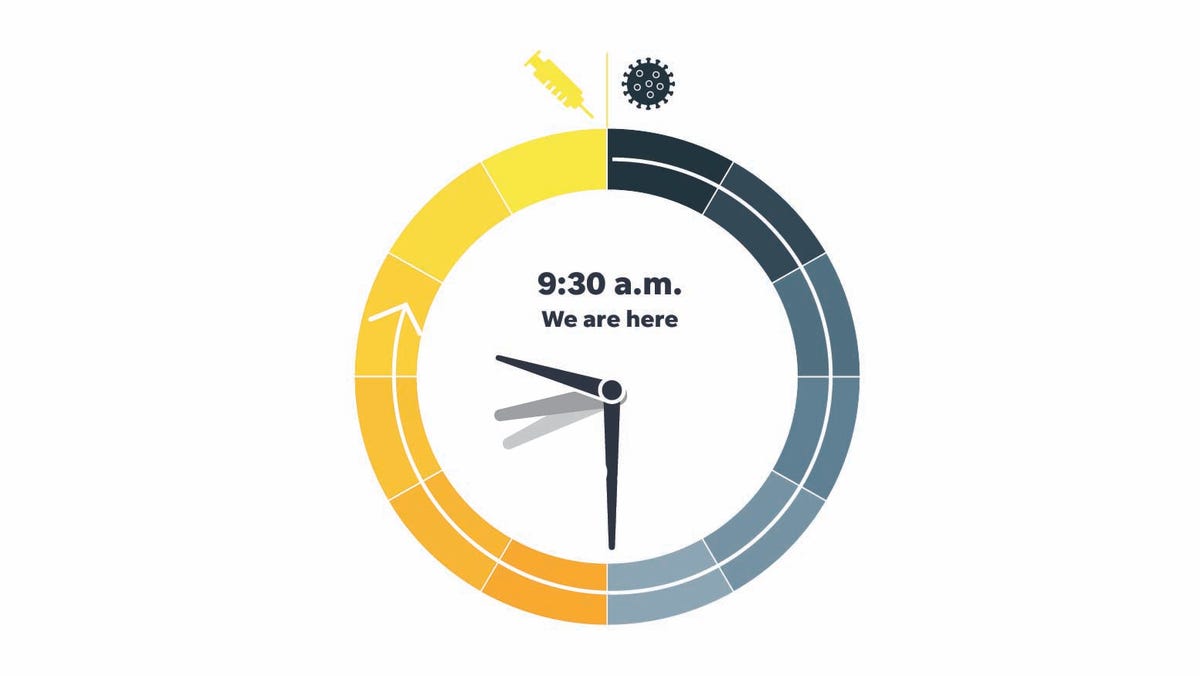 The members judge the time on a clock that began at midnight with the discovery of the dangerous new virus in early 2020, and ends at noon, when a vaccine is freely available across the U.S.